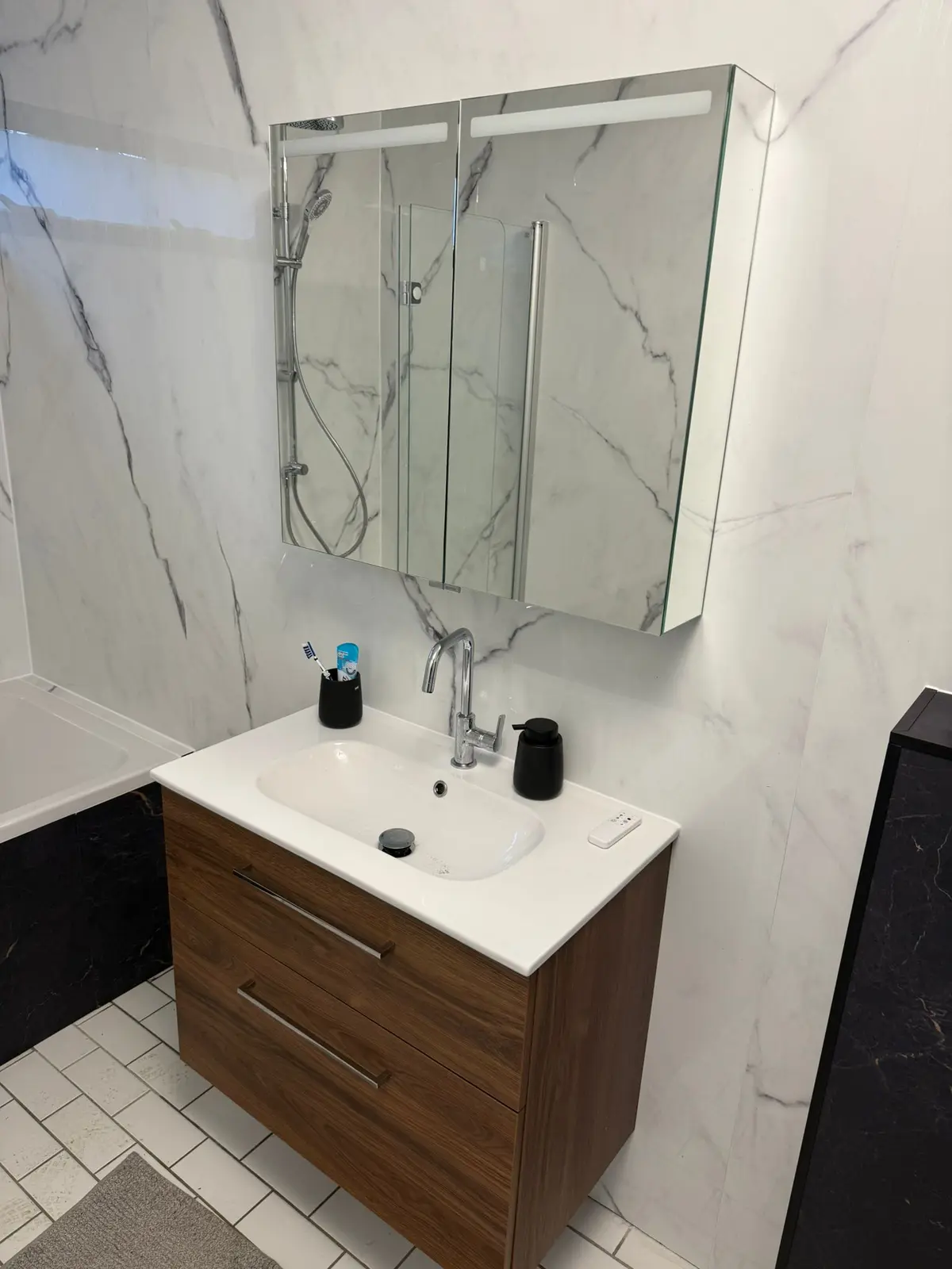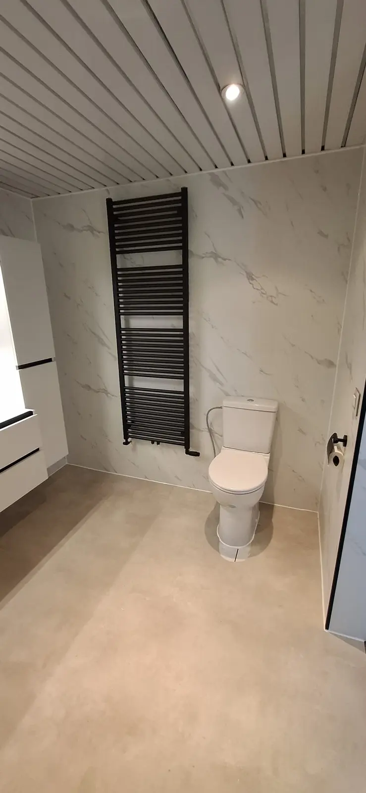Op 18 oktober 2025 voltooiden we een stijlvolle badkamerrenovatie. De nieuwe drempelloze inloopdouche met antislipvloer biedt maximale veiligheid en comfort. Samen met het zwevende toilet en de luxe marmerlook wandbekleding creëert dit een moderne, rustgevende uitstraling. Een veilige en prachtige badkamer voor jarenlang zorgeloos genieten.