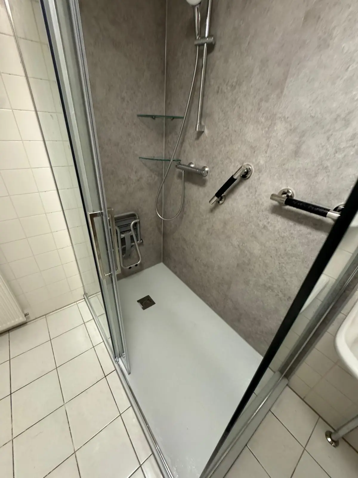Op 24-08-2023 realiseerden we een veilige en stijlvolle doucheruimte. De installatie van wandbeugels en een opklapbare douchestoel, gecombineerd met een antislip douchevloer, garandeert optimale stabiliteit en comfort. Deze moderne aanpassingen bieden onze klant een zorgeloze douche-ervaring, met behoud van een frisse en tijdloze uitstraling.