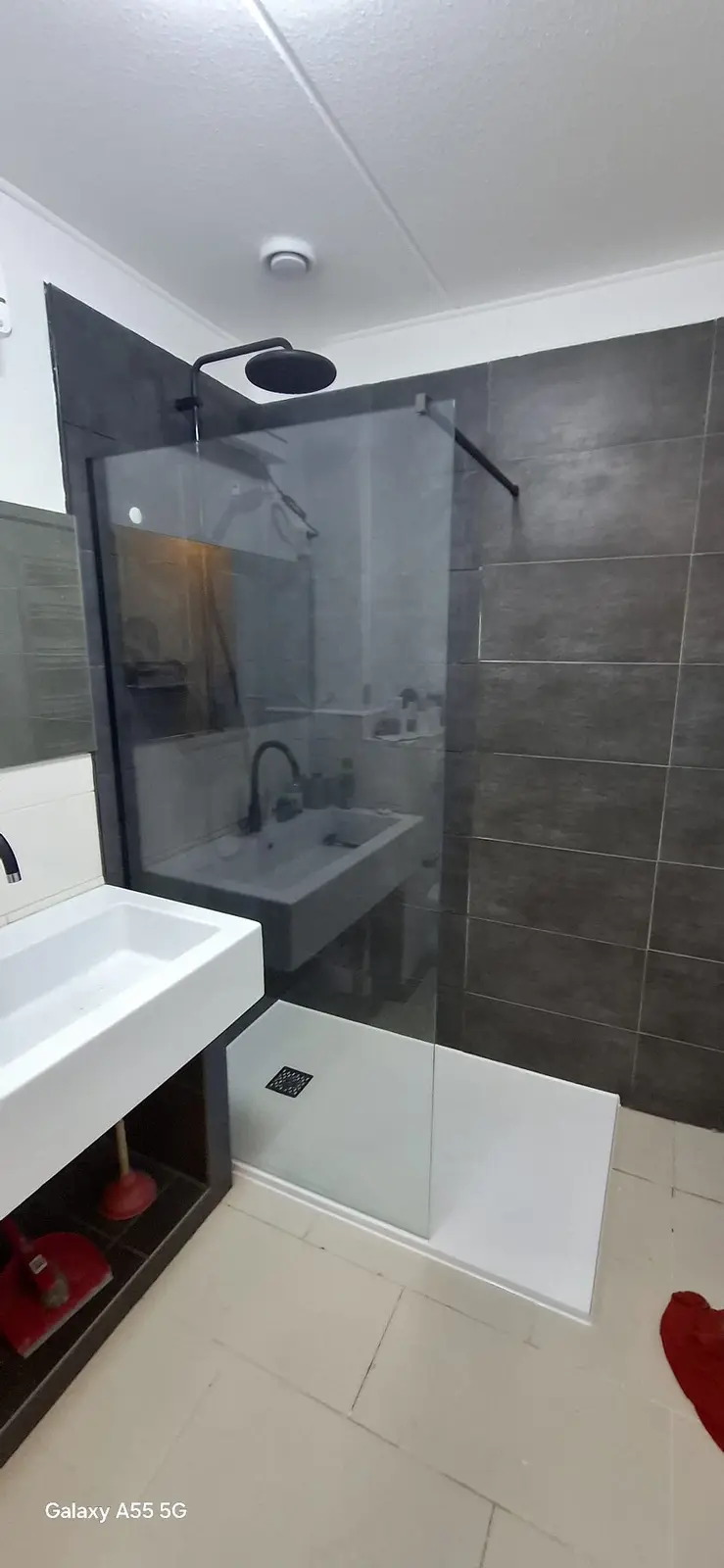 Op 17 juni 2025 voltooiden we een badkamerrenovatie gericht op veiligheid en stijl. De nieuwe drempelloze, antislip inloopdouche, aangevuld met wandbeugels en een douchezitje, biedt optimaal comfort en valpreventie. De moderne, elegante afwerking met een donkere marmerlook achterwand zorgt voor een luxe uitstraling. Een veilige en toegankelijke badkamer, perfect voor zorgeloos genieten.