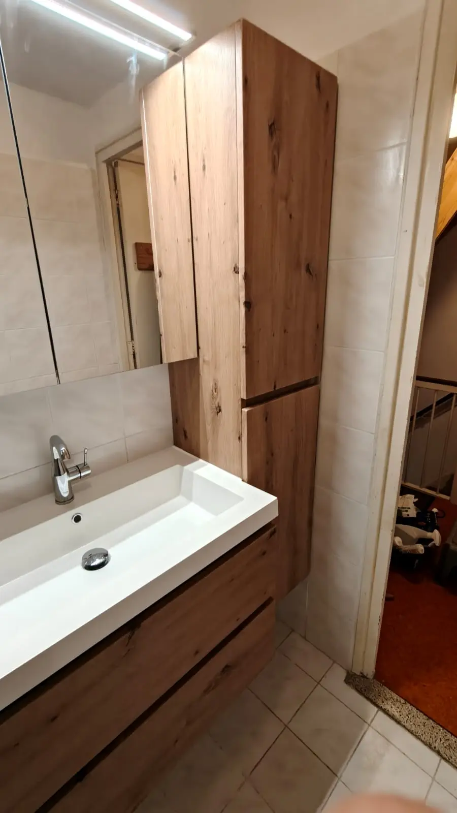 Deze badkamerrenovatie, afgerond op 2025-10-10, transformeerde de ruimte in een veilige en stijlvolle oase. Een drempelloze inloopdouche met antislipvloer en strategisch geplaatste wandbeugels garandeert maximale veiligheid en comfort. De moderne, warme uitstraling, met natuurlijke houttinten en strakke lijnen, creëert een tijdloze en toegankelijke badkamerervaring voor onze klant. Geniet zorgeloos van uw vernieuwde badkamer.